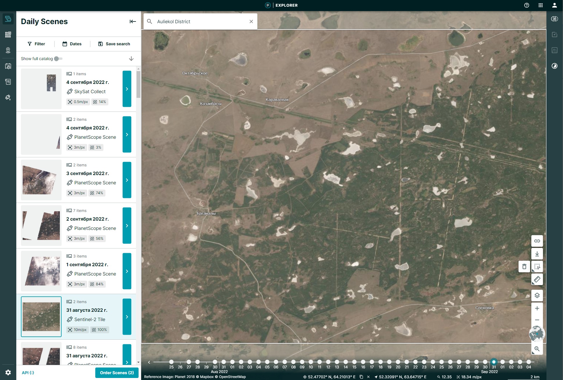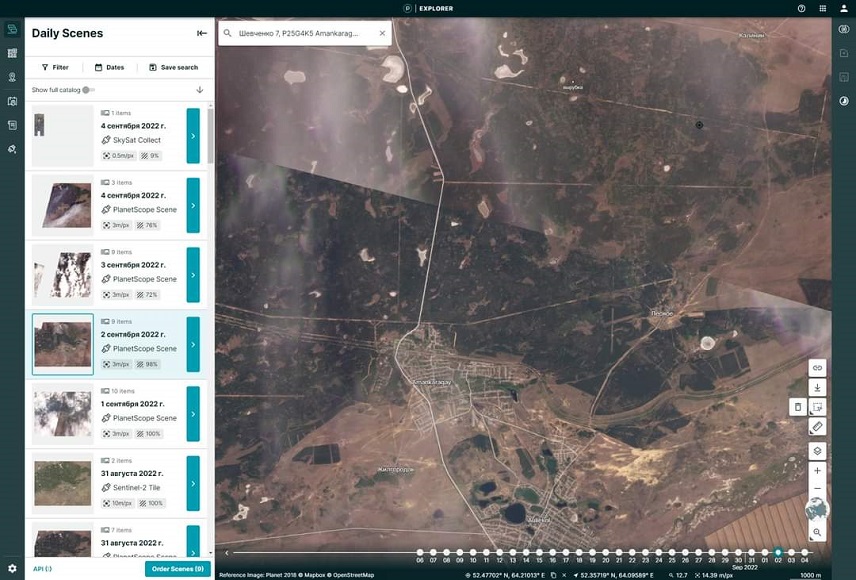 "В сети большое количество фото и видеоматериалов с комментариями. Хотел бы только показать истинные масштабы последствий на момент четвёртого сентября 2022 в 11:50 (по астанинскому времени). Снимки получены с космических аппаратов PlanetScope и SkySat компании PlanetLabs", - пишет о чрезвычайной ситуации специалист по дистанционному зондированию Земли.