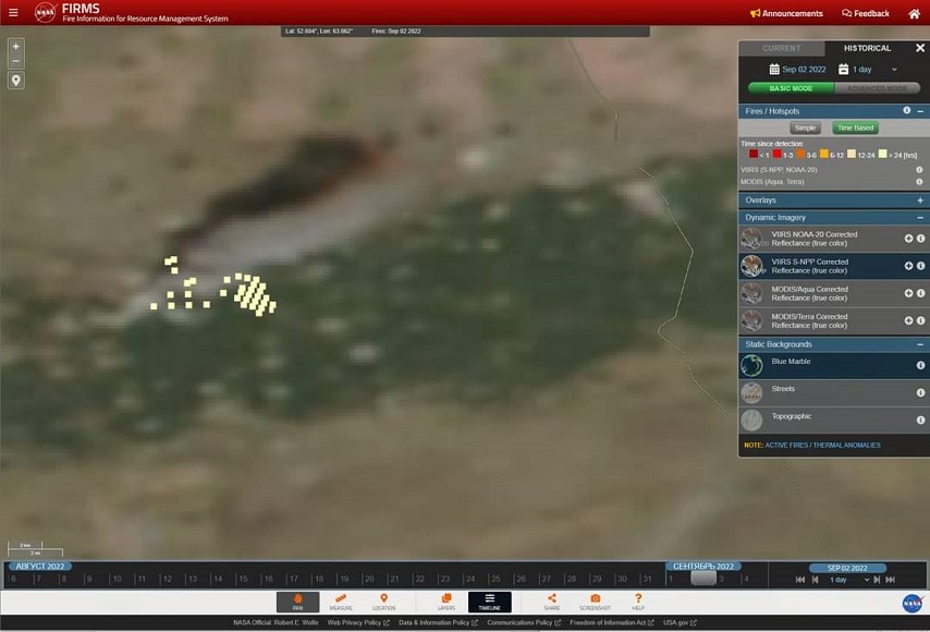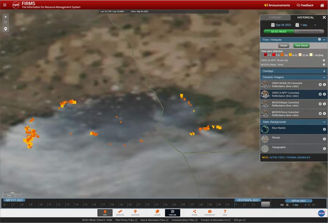 "Будут также приведены скриншоты с сервиса FIRMS (#NASA) по мониторингу термальных точек по всему миру. С помощью данного сервиса можно будет отследить динамику изменений очагов возгорания. Сервис доступен по этой ссылке", - написал автор.