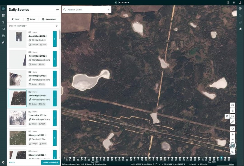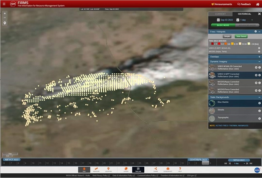 Третьего сентября - пожар распространяется на всю территорию лесного массива. Термальные аномалии видны почти по всему периметру. По снимку с сервиса FIRMS (низкого разрешения) видны клубы дыма а по снимку #PlanetScope видны активные очаги недалеко от населённого пункта Баганалы.