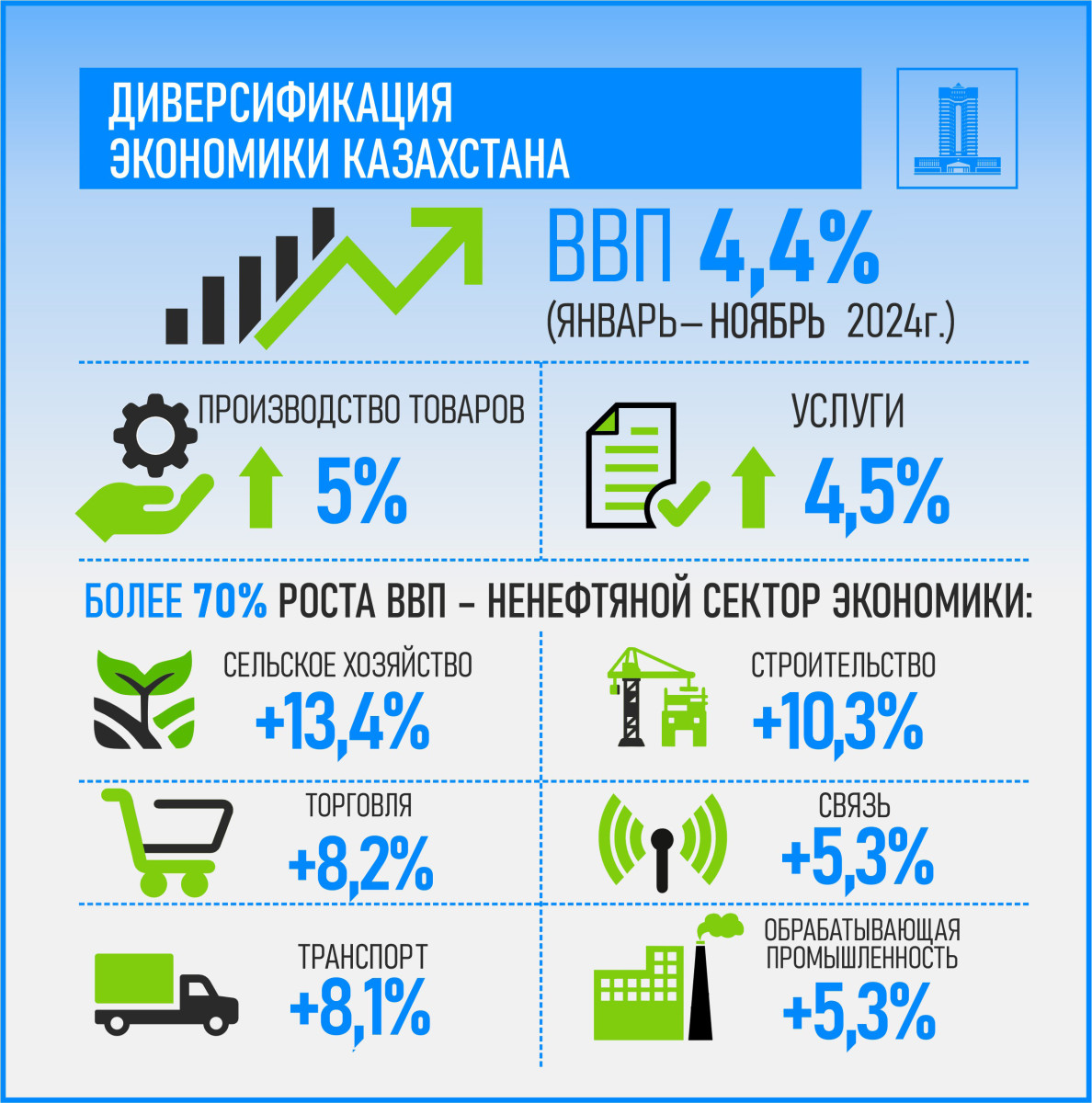 По предварительной оценке, рост ВВП по итогам 11 месяцев т.г. составил 4,4%, который преимущественно обеспечен развитием ненефтяного сектора. Более 70% роста экономики сложилось за счет обрабатывающей промышленности, торговли, сельского хозяйства и строительства. В разрезе отраслей наблюдается следующая динамика: в сельском хозяйстве отмечен рост валового выпуска продукции на 13,4%, что является наивысшим показателем с 2011 года; в строительстве – 10,3%; в торговле – 8,2%; услугах транспорта – 8,1%; связи – 5,3%; обрабатывающей промышленности – 5,3%. В целом, за указанный период производство отечественных товаров выросло на 5%, оказанные услуги – на 4,5%. Объем инвестиций в основной капитал увеличился на 3,1% и достиг 15,8 трлн тенге.