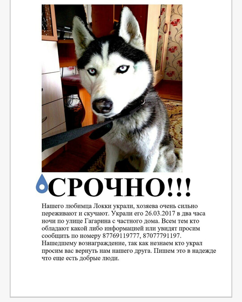 В группе «Ищем хозяина. Павлодар» «ВКонтакте» пользователи сообщают, среди ночи злоумышленники увели со двора частного дома по улице Гагарина пса кличке Локки. Хозяин просит вернуть собаку за вознаграждение.