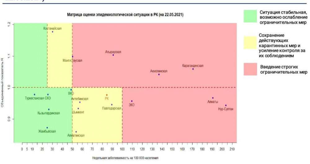Опубликована матрица оценки эпидемиологической ситуации в регионах Казахстана на 22 мая 2021 года, передает BaigeNews.kz со ссылкой на coronavirus2020.kz.