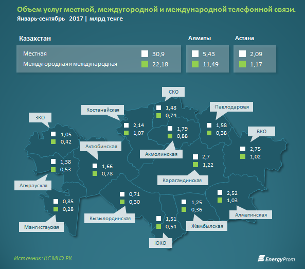 Постепенно отходят от услуг местной телефонии главные регионы-потребители этого сегмента - Алматы (-6,3% за год), ВКО (-8,6% за год), и Карагандинская область (-8,1% за год). В целом, телефонные сервисы теряют популярность практически во всех регионах. Незначительный прирост (всего +0,4%) отмечен лишь в Атырауской области.