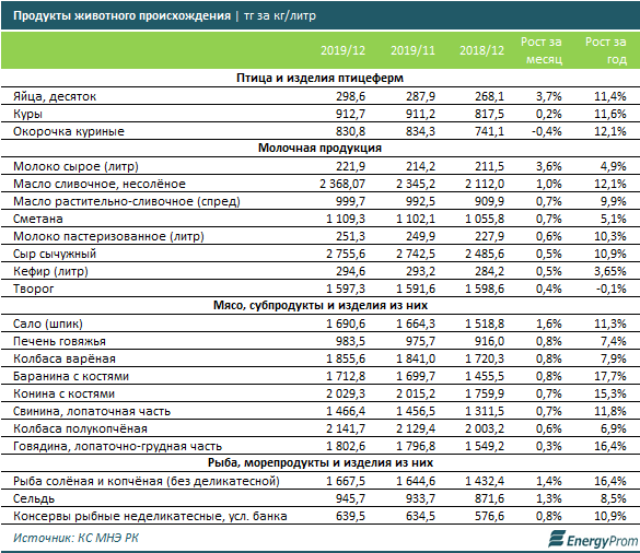 Среди продуктов животного происхождения за месяц заметнее всего подорожали яйца (+3,7%), сырое молоко (+3,6%), сало (+1,6%), солёная и копчёная рыба (+1,4%) и сельдь (+1,3%).