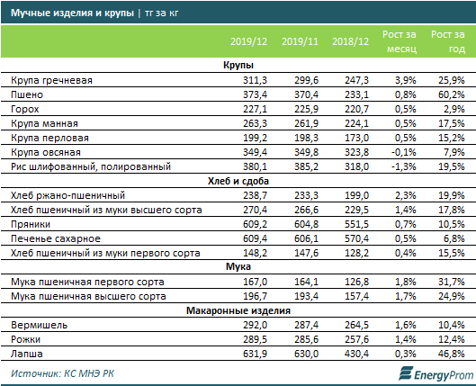 Среди мучных изделий и круп сильнее всего подорожали гречневая крупа (сразу +3,9% к ноябрю), ржано-пшеничный хлеб (+2,3%), пшеничная мука первого (+1,8%) и высшего (+1,7%) сорта и вермишель (+1,6% за месяц).
