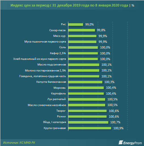 За первую неделю текущего года, с начала месяца по 8 января, цены на социально значимые продовольственные товары (включающие 19 наименований) выросли на 0,1%, передает BaigeNews.kz со ссылкой на Energyprom.kz.
