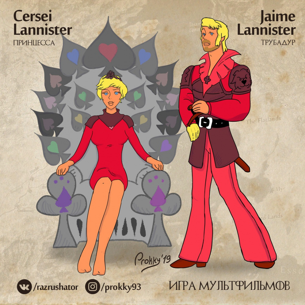 Художник изобразил Зайца и Волка из "Ну, погоди!" в образах Арьи Старк и Сандра Клигана, Малыш и Карлсон из одноименного мультфильма превратились в Джоффри Баратеона и Тириона Ланнистера, Винни Пух стал Сэмвеллом Тарли, Пятачок — Джоном Сноу. Чебурашка в исполнении автора примерил на себя роль Дейенерис Таргариен с драконом Геной.