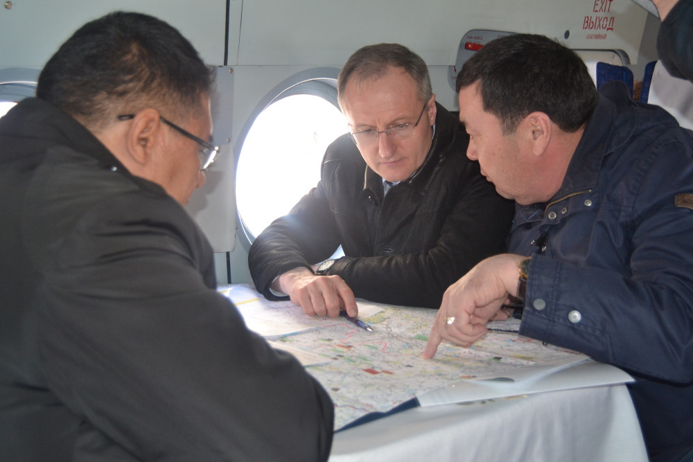 Поднявшись в воздух с аэродрома Кокшетау, вертолёт МИ – 8Т АО «Казавиаспас» взял курс на Айыртауский, Есильский, Аккайынский и Тайыншинский районы. За три часа была изучена паводковая обстановка на реках и озерах региона, особенно у сел Лавровка- Карасевка вдоль русла реки Камасакты до озера Большой Тарангул, Камышлового лога.