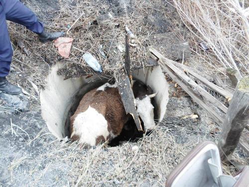 По словам хозяев, корова гуляла во дворе дома. Животное наступило на закрытую поверхность колодца, крытый материал не выдержал веса коровы, и она оказалась в ловушке.