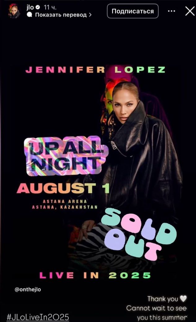 Напомним, концерт Дженнифер Лопес в Астане состоится 1 августа 2025 года. Это будет первое выступление суперзвезды в Казахстане, и ажиотаж вокруг события не утихает с момента анонса.