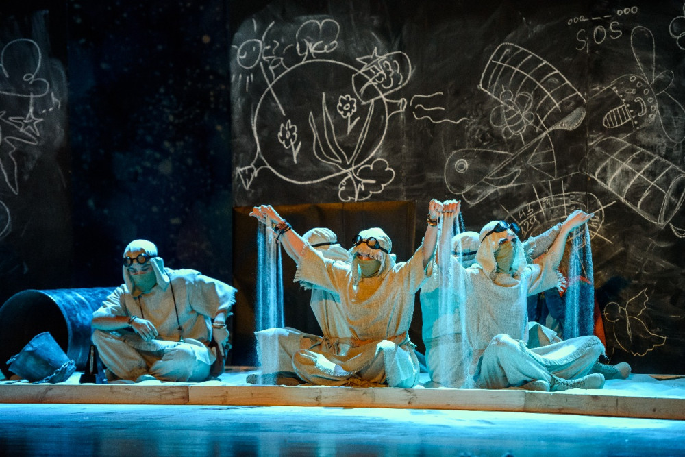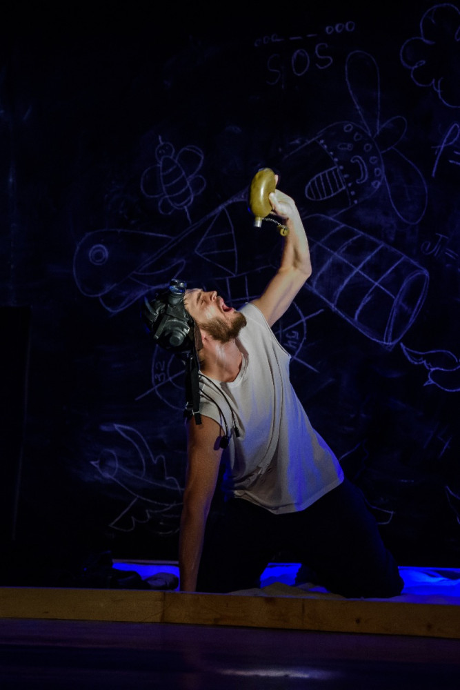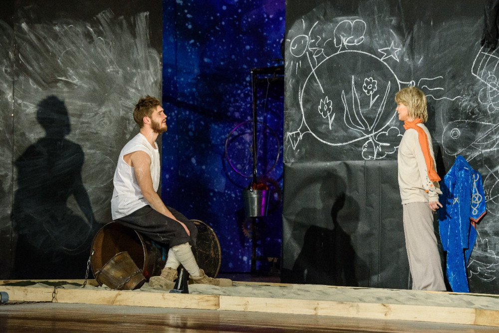 На протяжении всего спектакля они рисуют мелом – цветы, звёзды, упавший самолёт, астероиды, планеты (обозначая Марс и Венеру символами гендера, внося определённые отсылки к миру взрослых и напоминая, кто в зале - главный зритель) – делая их неотъемлемой частью сюжета.