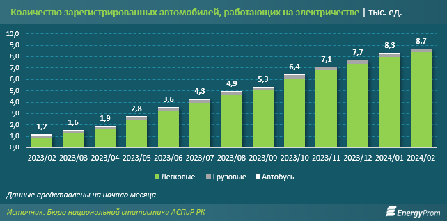 Общее же количество автомобилей разного типа, работающих на электричестве, судя по отчётам Бюро национальной статистики АСПиР РК, в феврале текущего года составило 8,7 тыс. - в 7,3 раза больше, чем годом ранее. Из них большая часть - легковые авто. Грузовых электромобилей и экоавтобусов в стране не так уж и много - всего чуть больше 300.