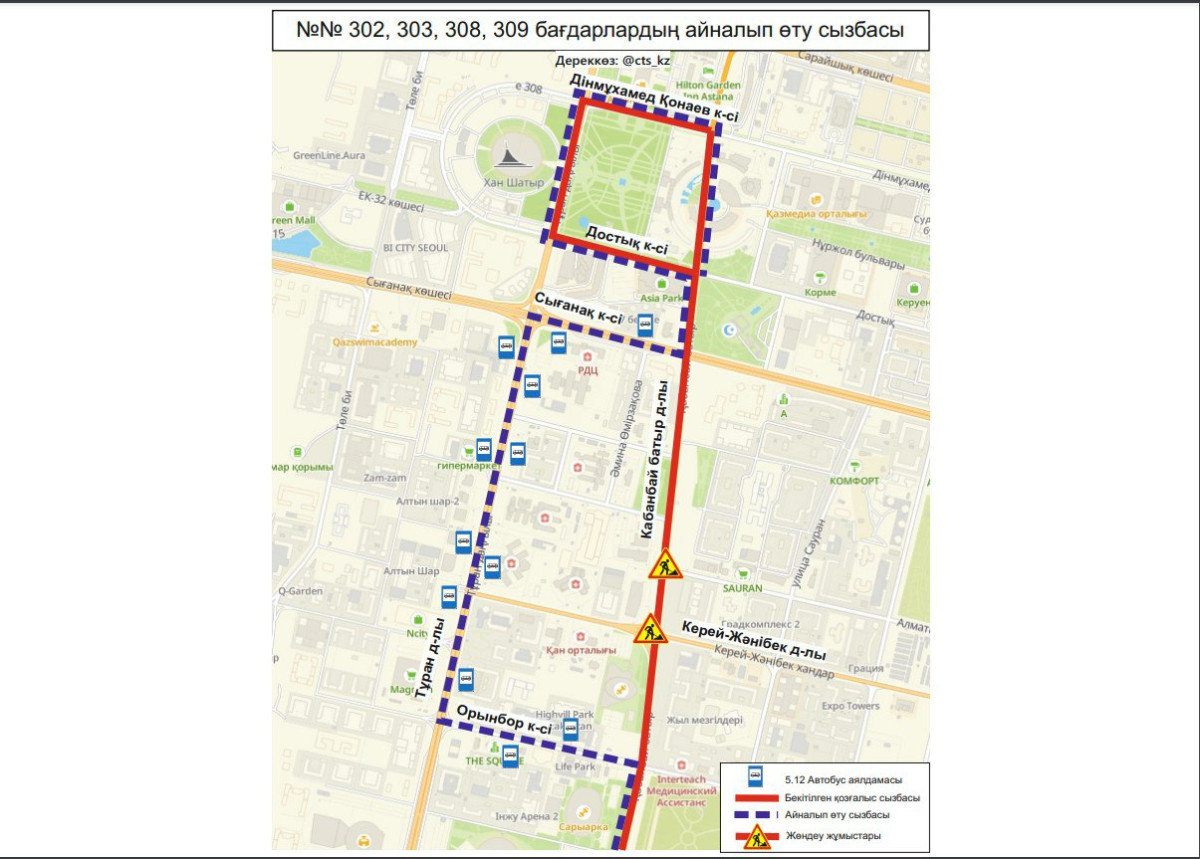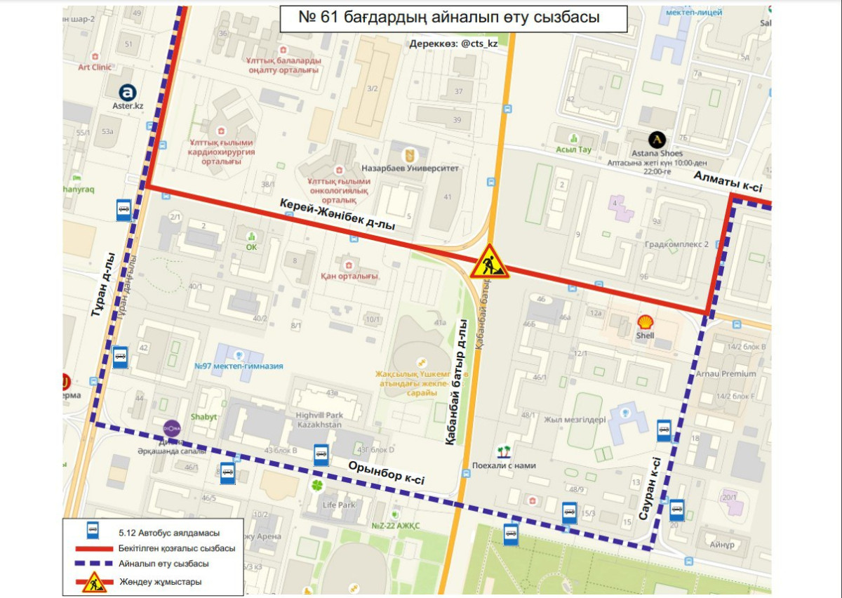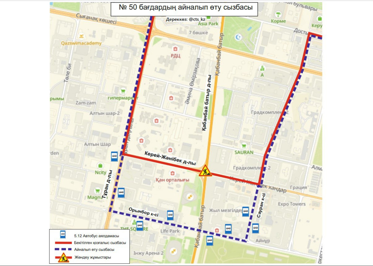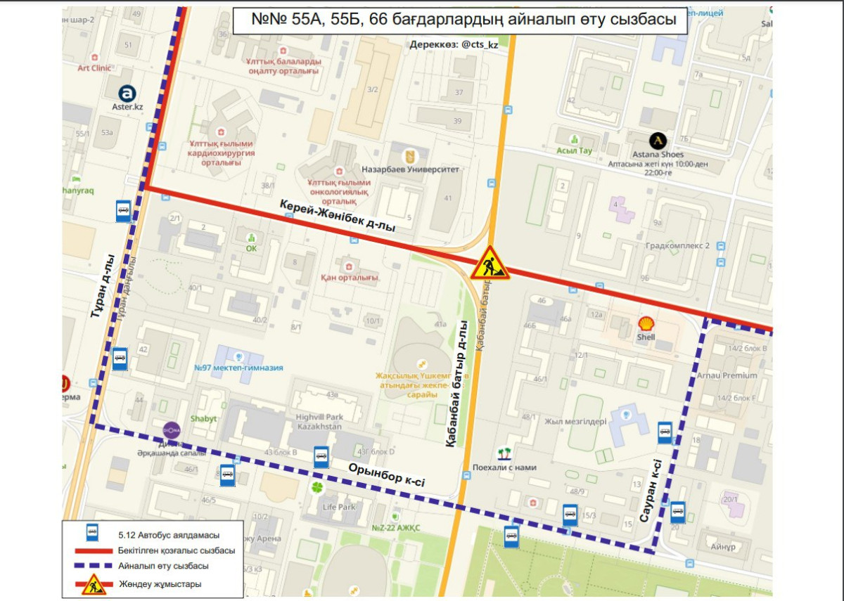 “До завершения ремонтных работ, временно изменены схемы движения маршрутов № 10, 37, 49, 50, 51, 53, 55А, 55, 55Б, 61, 66, 201, 302, 303, 308, 309. Просим заранее планировать свой маршрут”, - сообщили в ТОО "City Transportation Systems".