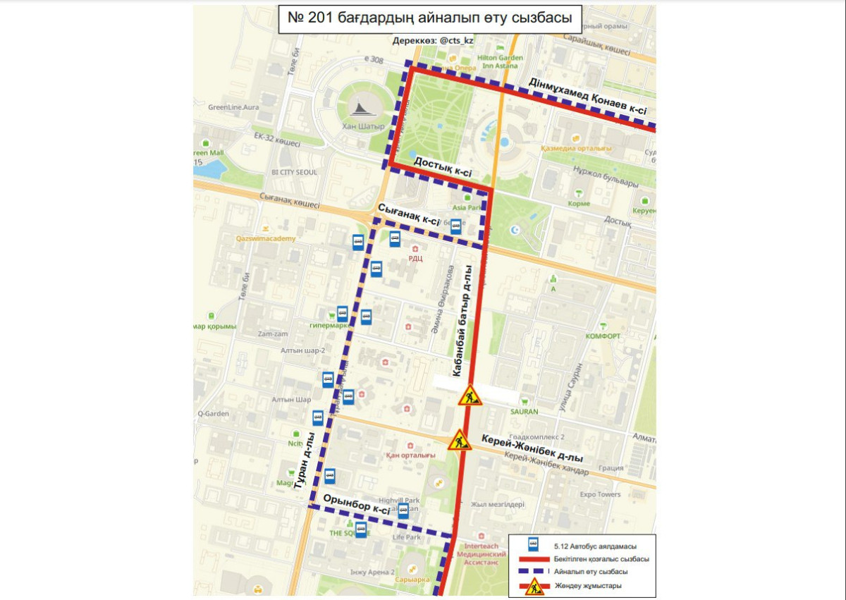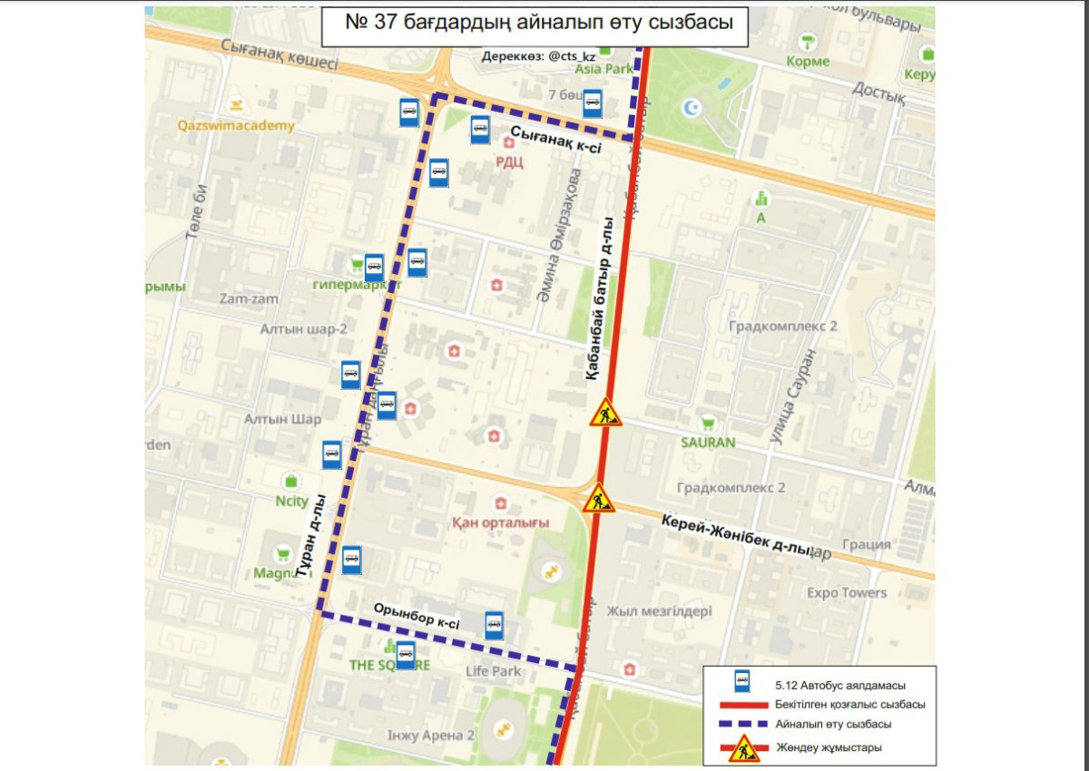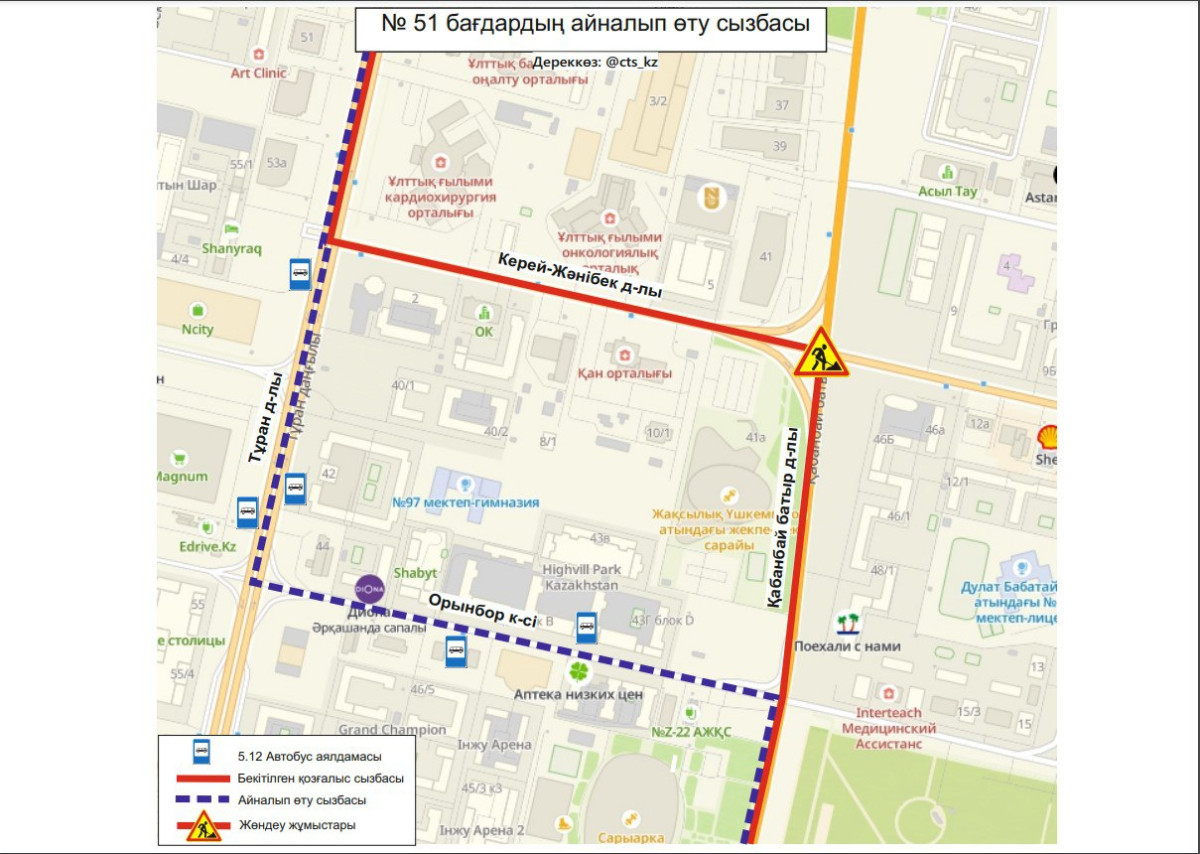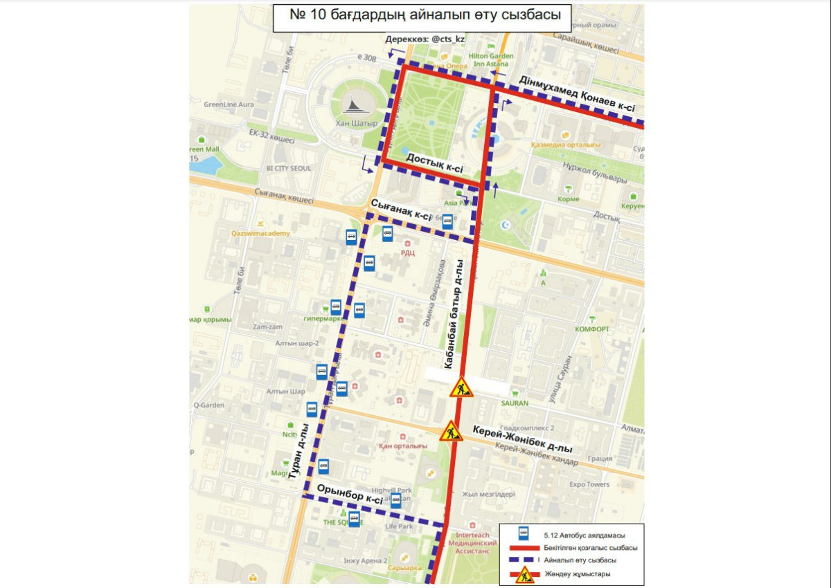 “До завершения ремонтных работ, временно изменены схемы движения маршрутов № 10, 37, 49, 50, 51, 53, 55А, 55, 55Б, 61, 66, 201, 302, 303, 308, 309. Просим заранее планировать свой маршрут”, - сообщили в ТОО "City Transportation Systems".