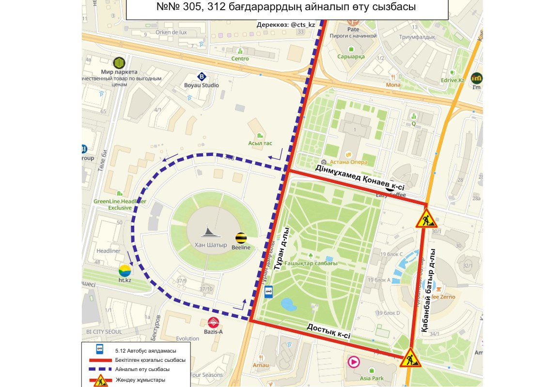 “До завершения ремонтных работ, временно изменены схемы движения маршрутов №№ 302, 303, 308, 309, 305, 312. Просим заранее планировать свой маршрут”, - сообщили в ТОО "City Transportation Systems".