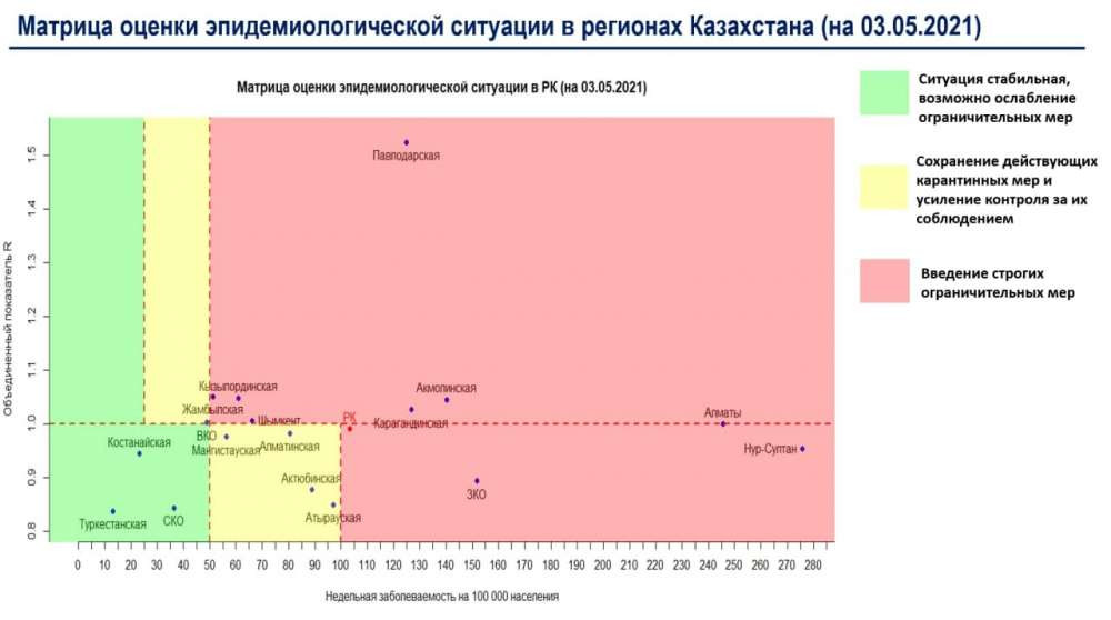 Обновлена матрица оценки эпидемиологической ситуации в регионах Казахстана на 3 мая 2021 года, передает