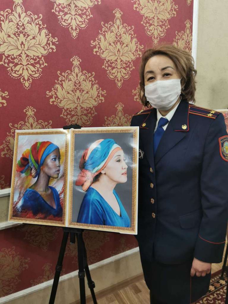 "Сочетание скромности и стального стержня, богатый внутренний мир — вот главное, на мой взгляд, в национальном женском характере, — говорит инспектор штаба УП Петропавловска Айсулу Кажикова. — Я воспроизвела образ "Девушки в красном камзоле" нашего современника Касымова, меня покорила энергетика портрета, кажется, эта девушка сейчас пустится в пляс".