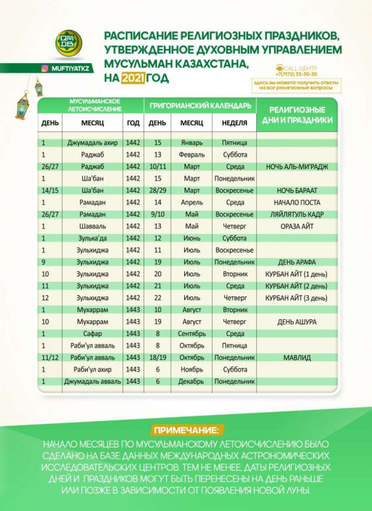 Согласно утвержденному расписанию религиозных праздников на 2021 год, ночь Аль-Мирадж пройдет с 10 на 11 марта, ночь Бараат - с 28 на 29 марта, а ночь предопределения Ляйлятуль Кадр пройдет с 9 на 10 мая.