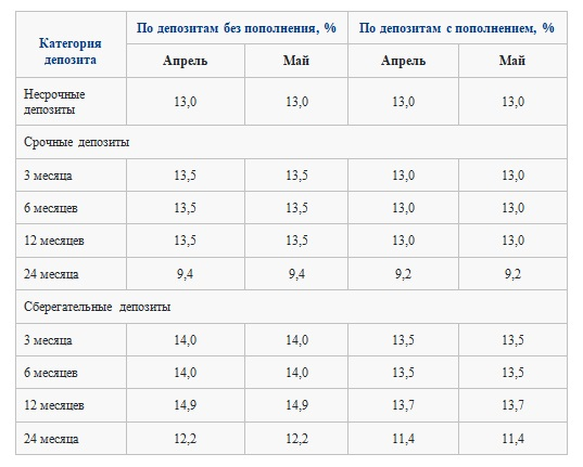 "Максимальные ставки по несрочным депозитам, краткосрочным срочным и сберегательным вкладам в тенге сохранены на уровне апрельских значений в связи с тем, что уровень базовой ставки Национального Банка Республики Казахстан остался без изменений", - говорится в сообщении.