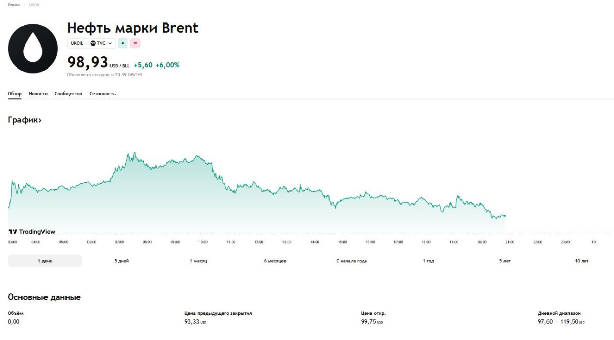 Меньше суток назад стоимость "черного золота" торговалась в пределах 119 долларов за баррель впервые с июня 2022 года. Теперь же цена колеблется в районе 98 долларов.