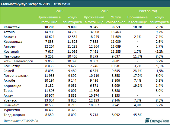 Для казахстанцев и гостей страны по итогам февраля текущего года сутки проживания в гостинице стоили в среднем 10,3 тысячи тенге — на 10% больше, чем годом ранее, передает BNews.kz со ссылкой на energyprom.kz.