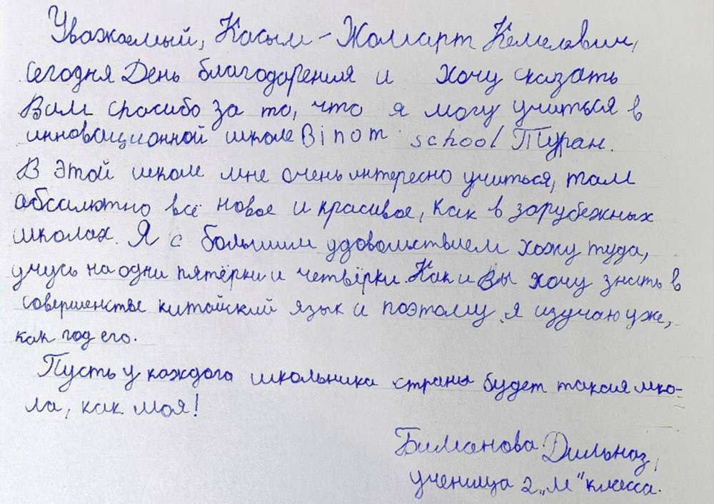 "В рамках Дня благодарности в адрес Главы государства по-прежнему поступают благодарственные письма от жителей страны. Одно из них пришло из г. Нур-Султана от ученицы 2 класса Дильназ Бимановой. В своем письме она поблагодарила Президента за возможность изучать язык и обучаться в школе, построенной по типу зарубежных учебных заведений", − написала Дильназ.