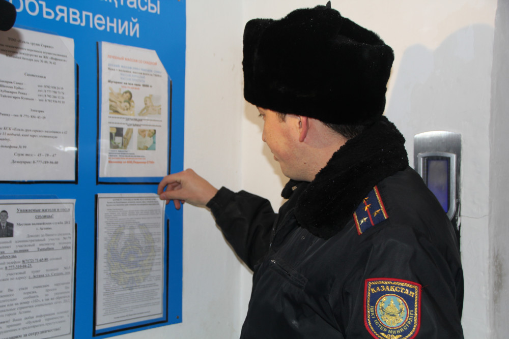 «В целях стабилизации оперативной обстановки в стране, а также предупреждения, выявления и пресечения проявлений экстремизма и терроризма, установления тесных доверительных отношений с гражданами на территории города Астаны проведено оперативно-профилактическое мероприятие «Участок». По результатам мероприятия проведено более 260 000 обходов», - сообщила инспектор местной полицейской службы ДВД Астаны Ляззат Бисембаева.