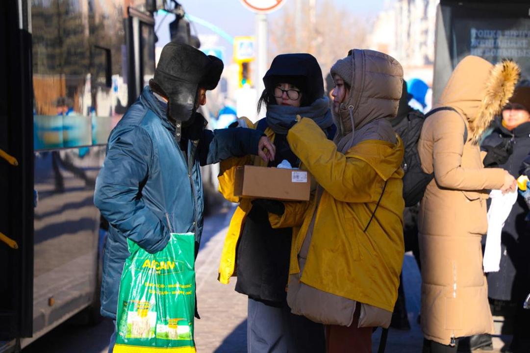 Волонтёры Молодёжного ресурсного центра "Астана жастары" организовали акцию чтобы угостить чаем пассажиров, ожидающих общественный транспорт, прохожих, делающих покупки в уличных торговых палатках и водителей автобусов.