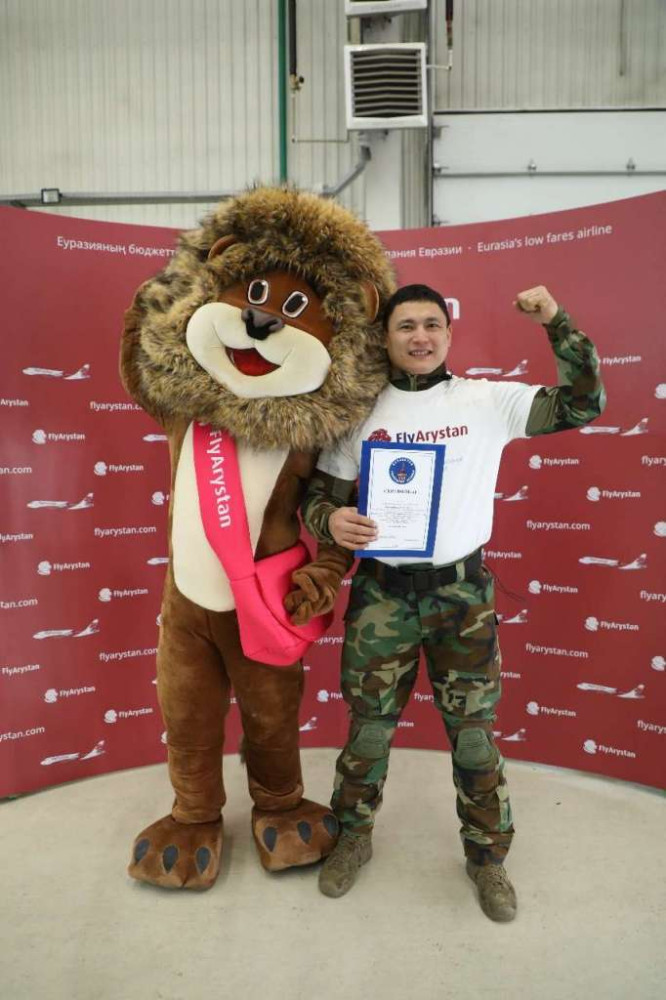 Свое достижение майор полиции посвятил Дню Первого Президента Республики Казахстан и 30-летию Независимости. Занимающийся силовым экстримом полицейский, протянул воздушное судно на 10 метров.