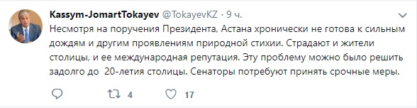 Спикер Сената Касым-Жомарт Токаев на своей странице в Twitter высказался о неготовности столицы к обильным осадкам, передаёт BNews.kz.