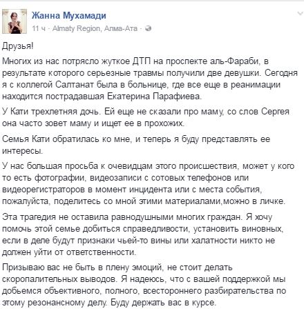 пост Жанны Мухамади в Facebook