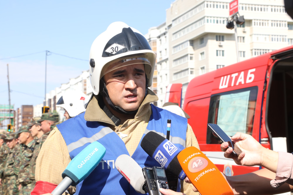 "Отрабатываем действия со службами. Сложность пожара оценивается на самом высоком ранге. У нас есть новая техника, будем подавать компрессионную пену. Она легче воды, и мы ее сможем подать на 33-й этаж. Будем в пешем порядке прокладывать рукавные линии по лестничным маршам снизу вверх. На это у нас уходит около получаса. То есть это в пешем порядке, лифты выключаются. Также мы сегодня будем отрабатывать тушение пожара в реалиях, в пешем порядке. (..) У нас в гарнизоне есть план пожаро-тактических учений, где объекты мы выбираем сами. И по этому плану мы проводим учения для себя и сотрудников персонала объекта. С начала года мы провели учения во многих объектах– Ханшатыре, Дворце Независимости, Пирамиде", - сказал начальник отдела организации пожаротушения ДЧС Астаны Саят Кажимов.