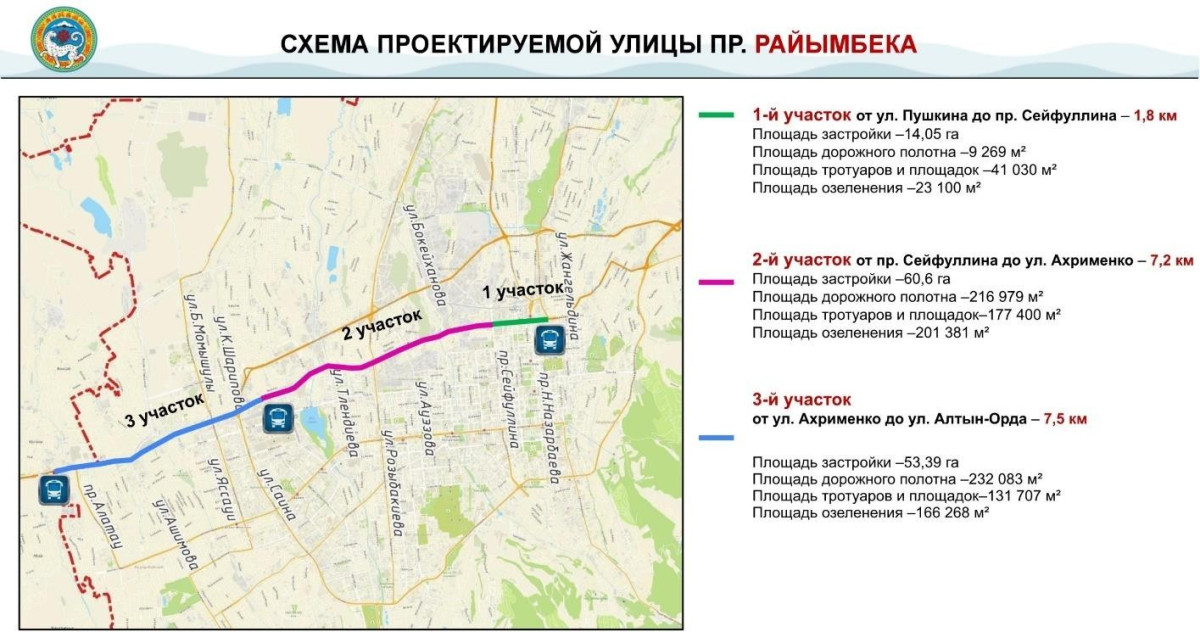 Проект разбит на три участка: улица Пушкина — проспект Сейфуллина, проспект Сейфуллина — улица Ахрименко, улица Ахрименко — улица Алтын Орда.