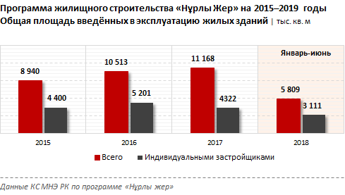 В рамках жилищной программы "Нұрлы Жер" за период 2017–2021 годов запланировано финансирование в размере 813,5 млрд тенге и увеличение ежегодного ввода жилья с 10,1 млн кв. м в 2017-м до 15,2 млн кв. м в 2021-м. Мониторинг реализации жилищной программы статкомитет отслеживает два показателя: общую площадь введённых в эксплуатацию жилых зданий и, в том числе, площадь зданий, введённых в эксплуатацию индивидуальными застройщиками.