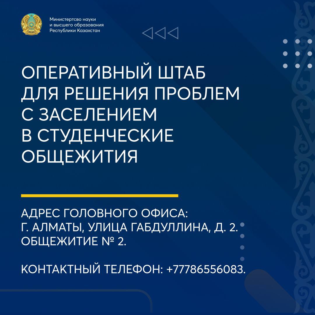 "Мы предоставляем студентам, которые не могут разместиться в общежитиях, возможность жить хостелах за льготную плату в 20-25 тысяч тенге в месяц. Создали специальный штаб. Он расположен в общежитии Satbayev University. В штаб могут обратиться первокурсники, студенты из социально уязвимых слоев населения, а также студенты, которые не смогли найти квартиру в аренду или попали в трудную ситуацию. Штаб работает 24 часа. Постараемся сразу решать подобные ситуации. Студентам, оказавшимся в трудной жизненной ситуации, мы найдем место. Будем договариваться с вузами и постараемся их разместить", – пообещал министр.