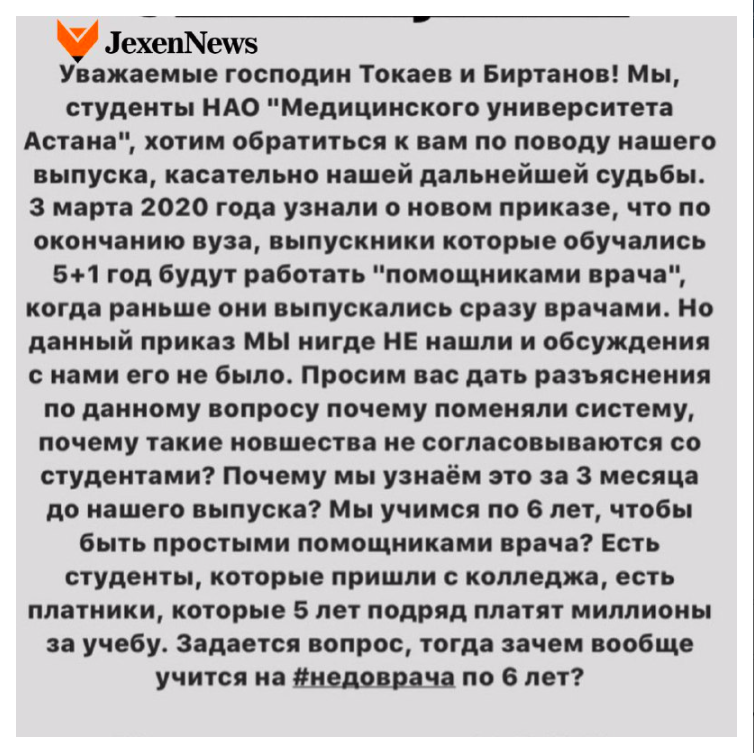 Обращение студентов к Главе государства появилось в соцсетях. Будущие врачи просят разъяснить правомерность нового приказа, с которым студентов ранее не ознакомили, однако предъявили за три месяца до выпуска.