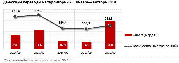 За 9 месяцев этого года казахстанцы перевели друг другу по РК через системы международных денежных переводов 57 млрд тенге. Этот показатель в четыре раза превышает данные 2017 года, передаёт BNews.kz со ссылкой на ranking.kz.