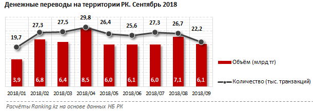 При этом, пик активности по объёму переводов на территории Казахстана в этом году наблюдался в апреле - 8,5 млрд тенге; тогда же было и самое большое количество транзакций — 29,8 тысячи.