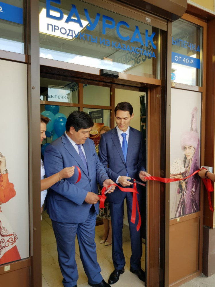 В торжественной обстановке красную ленточку перерезали советник-посланник Посольства Казахстана в РФ Нуржан Каджиакбаров, руководитель Торгового представительства Казахстана в России Бауржан Сартбаев и учредитель торговой сети "Баурсак" Елена Кондакова.