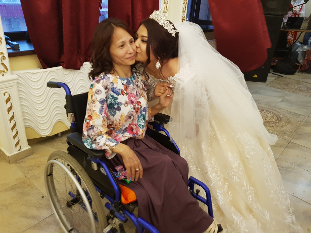 Гулим, потанцевав немного с женихом, все время возвращается к маме. Присаживается на корточки перед инвалидным креслом, поправляет ей красивые локоны.
