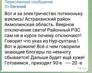 В популярных казахстанских Telegram-чатах распространяется сообщение о том, что из-за "указа из Нур-Султана" жители Акмолинской области остались без электричества, передает BaigeNews.kz со ссылкой на StopFake.kz.