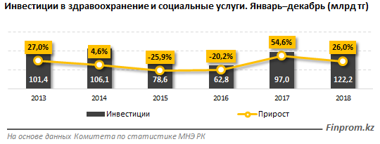 По предварительным данным 2018 года, инвестиции в здравоохранение и социальные услуги составили 122,2 млрд тенге на 26% больше, чем годом ранее. В 2017 году сумма инвестиций достигала 97 млрд тенге, при годовом росте на 54,6%, передаёт BNews.kz со ссылкой на finprom.kz.