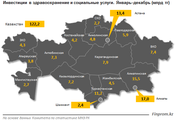За январь–декабрь 2018 года из бюджетных средств было выделено инвестиций в здравоохранение и соцуслуги на сумму 72,5 млрд тенге (доля — 59,4%). Средства местного бюджета составили 52,4 млрд тенге (42,9%) от общего объёма инвестиций в здравоохранение), годовой прирост — 47%. Из республиканского бюджета было выделено 20,1 млрд тенге, или 16,5%.