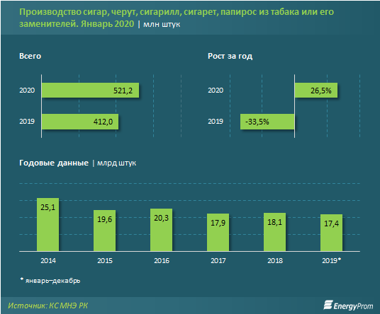 В январе 2020 года производство сигарет и прочей табачной продукции увеличилось на 26,5 процента за год и составило 521,2 миллиона штук. При этом в соответствующем периоде 2019 года производство показывало спад на 33,5 процента, до 412 миллионов штук.
