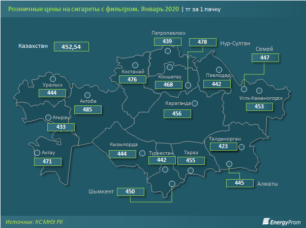 В январе текущего года наблюдался рост цен на сигареты. Средняя цена одной пачки сигарет увеличилась на 10,4 процента за год и составила 452,5 тенге. Напомним, с 1 января 2020 года ставки акцизов на сигареты повышены на 13,8 процента, до 9900 тенге за 1000 штук, что является одной из главных причин роста цен на сигареты.
