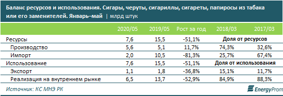 В агентстве отметили, что казахстанские компании обеспечили спрос на сигареты и папиросы на 74,3 процента по итогам пяти месяцев текущего года. На долю импорта соответственно пришлось 25,7 процента. Объем импорта за год сократился в 5,4 раза.