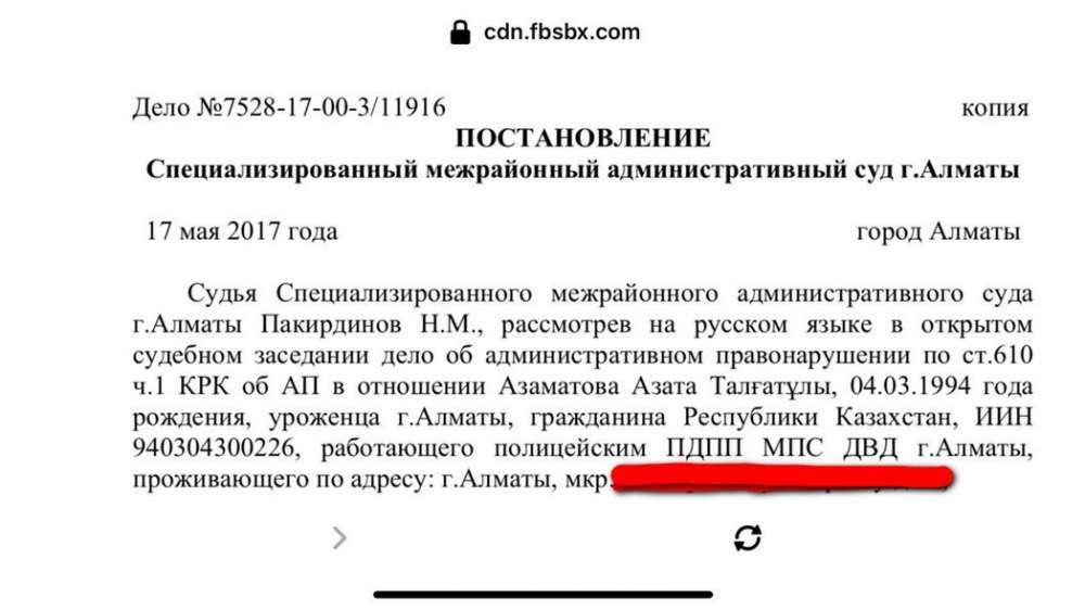 "В своем посту Шамшархан Умирзаков указал, что отца водителя, протаранившего блокпост, звали Талгат. По сведениям СМИ имя водителя БМВ — Азат Азаматов. Согласно данным Комитета госдоходов, у нас один АЗАМАТОВ АЗАТ ТАЛҒАТҰЛЫ (учитывая имя отца Талгат, других с таким отчеством нет) kgd.gov.kz/ru/services/taxpayer_search. Правда он 1994 года, рожденных с таким именем в 1992 база КГД не находит. В "Судебном кабинете" нашел постановление СМАС г.Алматы, согласно которому, Азаматов Азат Талғатұлы работал полицейским ПДПП МПС ДВД г.Алматы (скриншот прилагается, http://office.sud.kz/lawsuit/document.xhtml)", — обнародовал новые факты юрист Болат Бегимов.