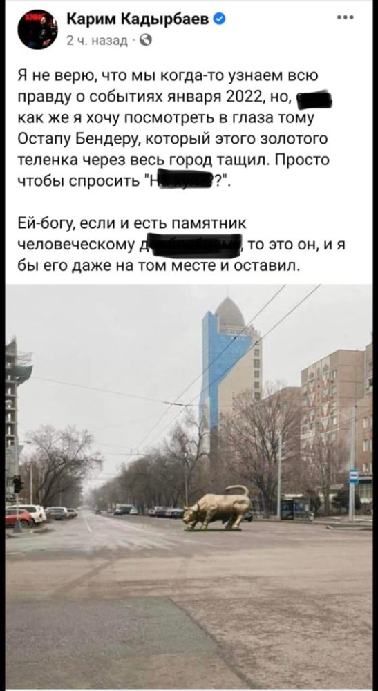 "Говорят этого быка с Аль-Фараби до Толе би - Ауэзова притащили. Позже этот бык стоял посередине перекрестка. UPD: этот бык там уже был, на Аль-Фараби другой. Итого в Алматы есть как минимум два быка. Причем тут бык", - пишет паблик vkurse_astana.