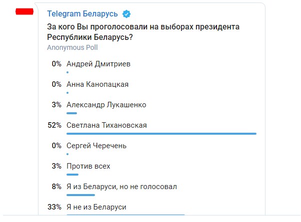 На данный момент голоса распределились следующим образом: единый кандидат от оппозиции Светлана Тихановская набрала большую часть голосов – 52 процента. Еще восемь процентов принявших участие в опросе сообщили, что не голосовали. Действующего президента Александра Лукашенко в опросе Telegram поддержали три процента. Кроме того, 33 процента участников опроса выбрали вариант "Я не из Беларуси".