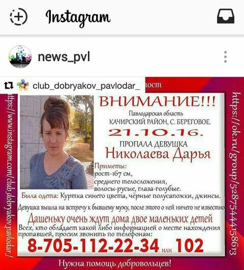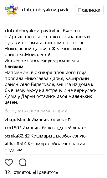«Вчера в р.Иртыш (всплыло) тело с связанными руками ногами и пакетом на голове Николаевой Дарьи, в Железинском районе, с.Моисеевка! Искренне соболезнуем родным и близким!», - сообщили пользователи Instagram.